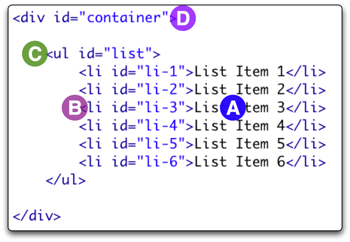 We'll start with some structural markup — a <div> containing a <ul> with 6 <li> children. Note that our list items have ID attributes — this gives us a way to uniquely identify them when we process clicks and mouseovers at the container level.